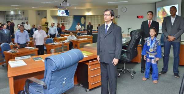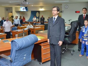 A lutadora de Jiu-Jitsu Eduarda Keiko, 8 anos, visitou a Câmara Municipal na manhã desta quinta-feira (23), durante a Sessão Ordinária. Recentemente, a jovem atleta conquistou a medalha de bronze no Pan Kids, realizado em Los Angeles, nos Estados Unidos. Eduarda foi recepcionada pelo Presidente da Casa, Leandro Anastácio (SD), e participou da execução dos Hinos com todos os vereadores.