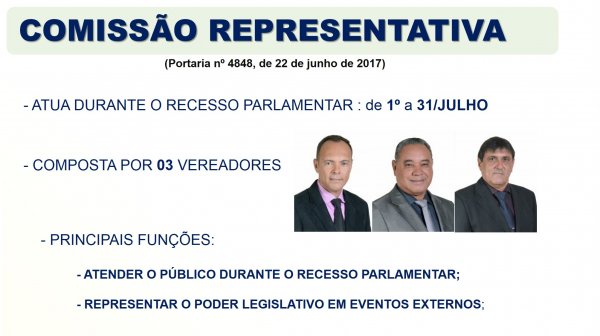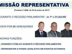 Por meio da Portaria nº 4848, de 22 de junho de 2017, o Presidente da Câmara, Leandro Anastácio (SD), definiu os três vereadores que vão compor a Comissão Representativa que vai atuar durante o Recesso Parlamentar, de 1º a 31 de julho. Carlão do Basquete (PROS), João Mulata (PSDB) e Euripinho (PDT) serão os responsáveis por manter o antedimento do Legislativo no período.