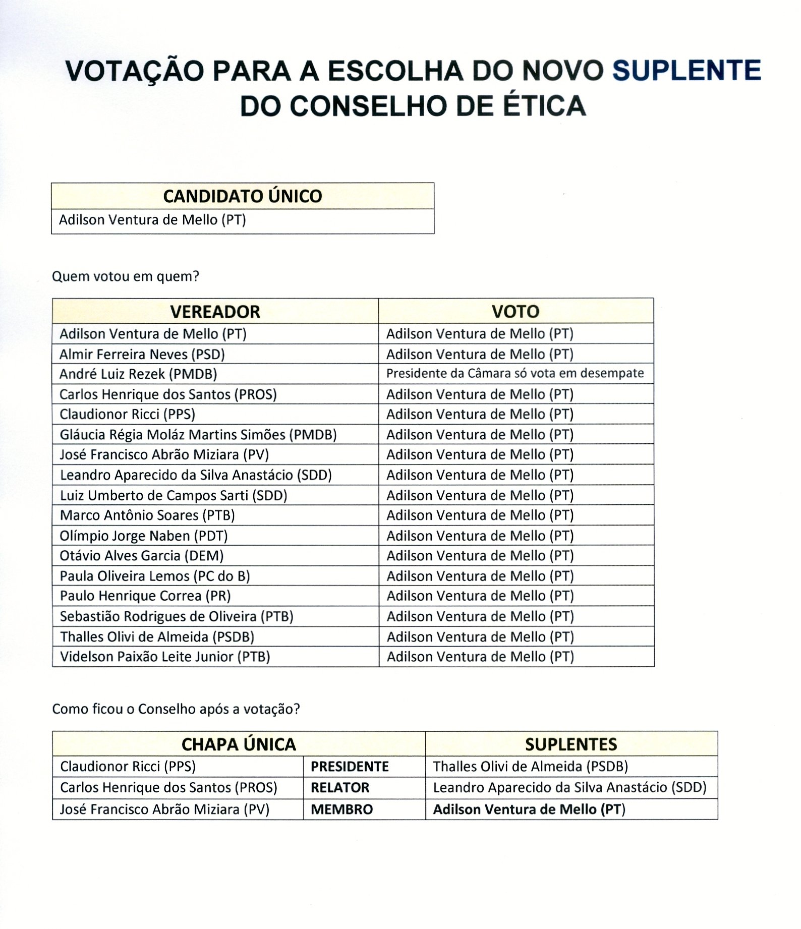 Após a renúncia, foi preciso realizar uma nova eleição entre os vereadores para preencher as funções em aberto. Com 9(nove) votos, o vereador Olímpio Jorge Naben - Euripinho (PDT) foi eleito o novo membro da Comissão de Educação. Já para o posto de suplente do Conselho de Ética, o escolhido por unanimidade foi o vereador Adilson Ventura de Mello (PT). Veja abaixo como foram as votações: