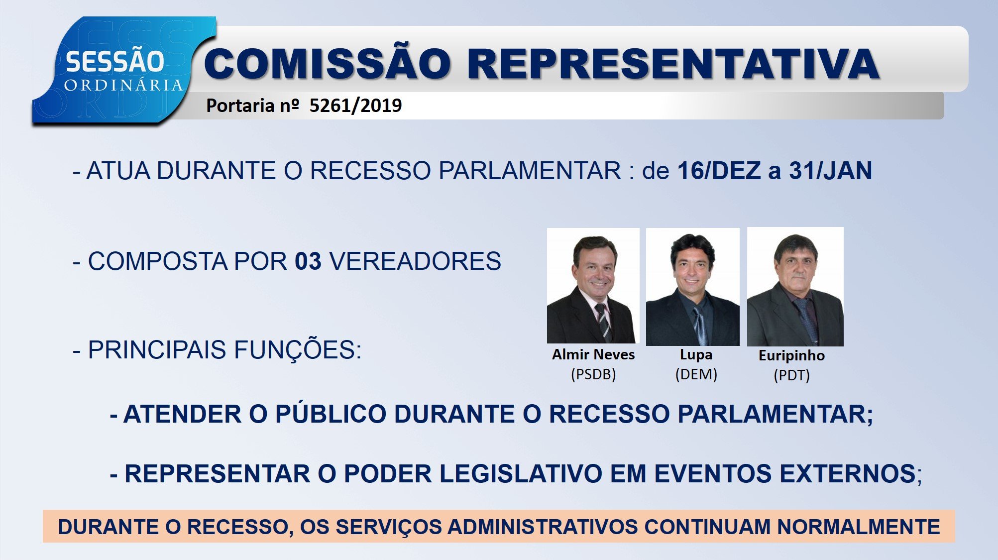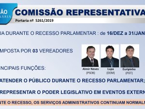 O Presidente da Câmara, João Mulata (PSDB), por meio da Portaria nº 5261/2019, nomeou os três vereadores que vão compor a 'Comissão Representativa' que vai atuar durante o Recesso Parlamentar, de 16 de dezembro a 31 de janeiro de 2020. Os vereadores escolhidos foram Almir Neves (PSDB), Euripinho (PDT) e Lupa (DEM). Os três ficarão responsáveis por manter o antedimento do Legislativo no período.