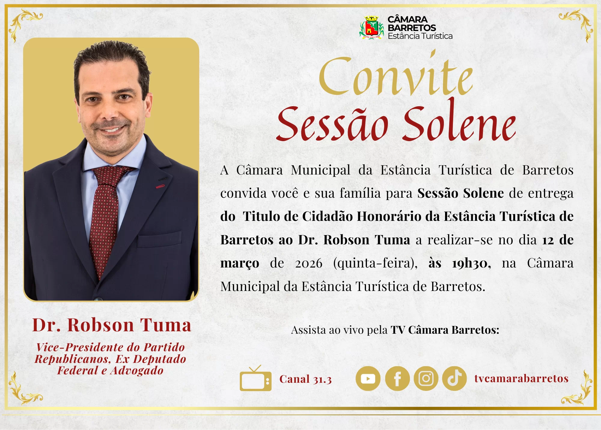 A Câmara Municipal de Barretos realizará no dia 12 de março (quinta-feira), às 19h, Sessão Solene para entrega do Título de Cidadão Honorário da Estância Turística de Barretos ao Dr. Robson Tuma, Presidente do Partido Republicanos da capital de São Paulo.