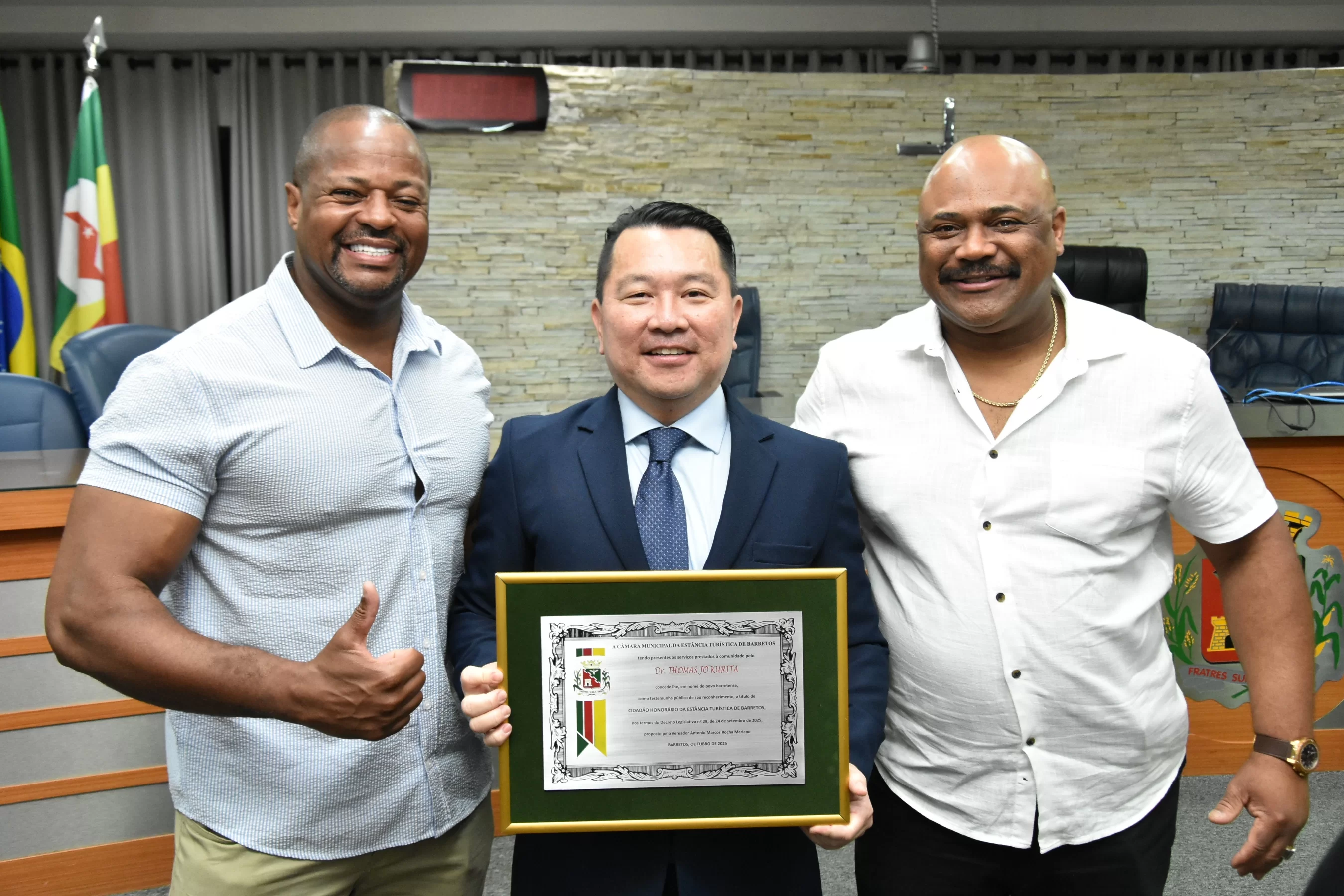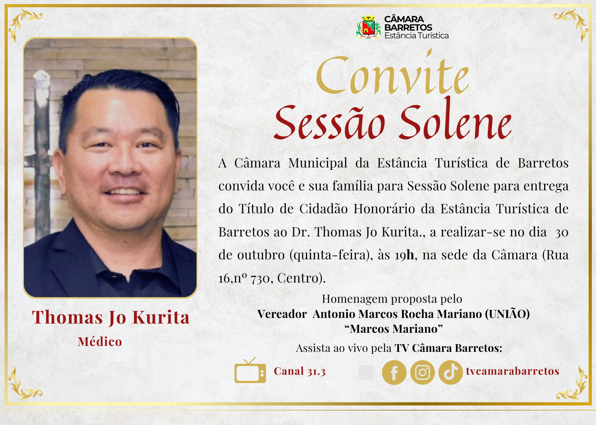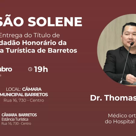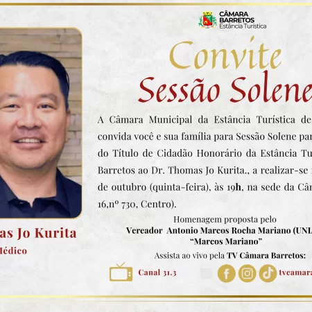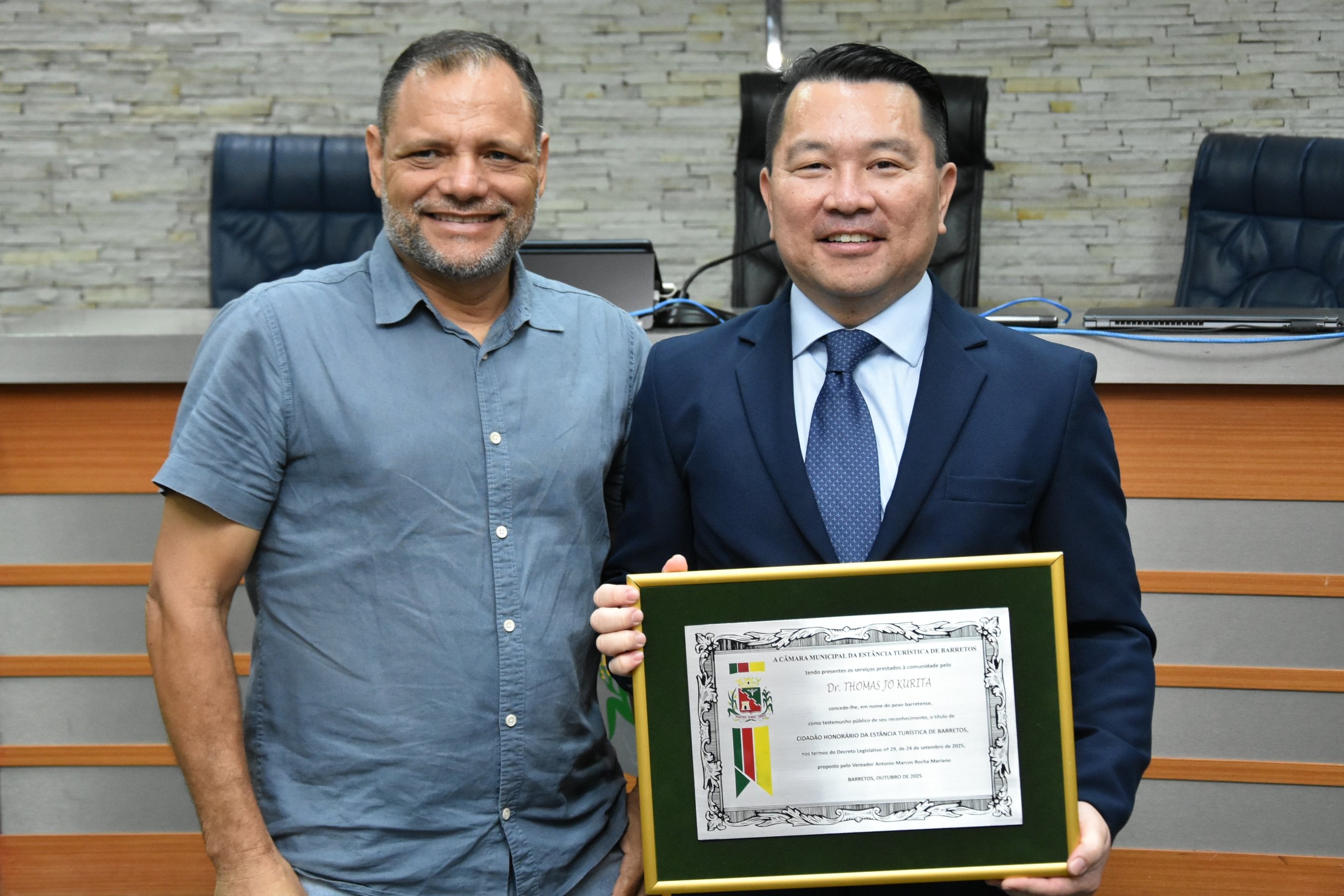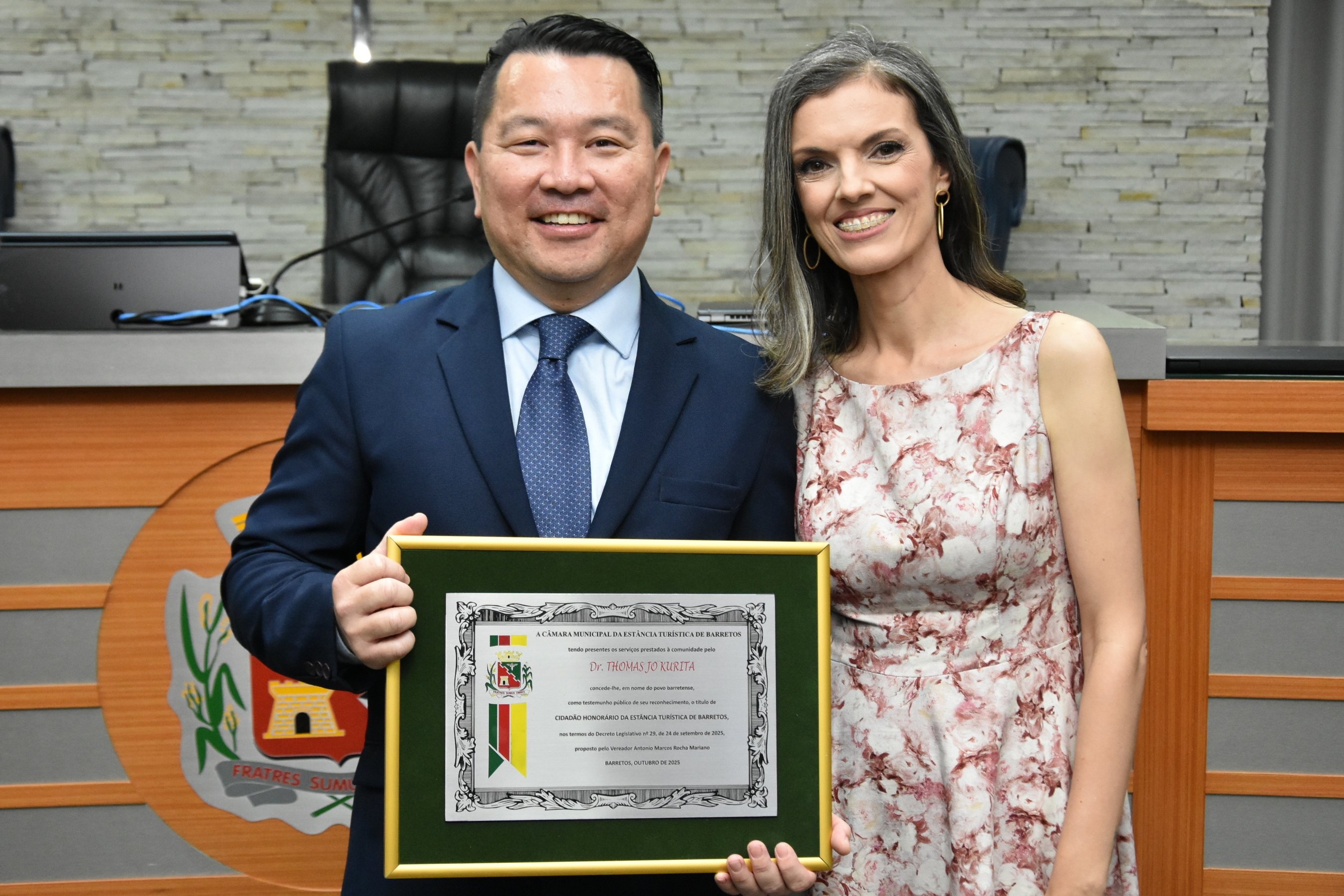 A Câmara Municipal de Barretos realizou no dia 30 de outubro (quinta-feira), às 19h, Sessão Solene para entrega do Título de Cidadão Honorário da Estância Turística de Barretos ao Dr. Thomas Jo Kurita.