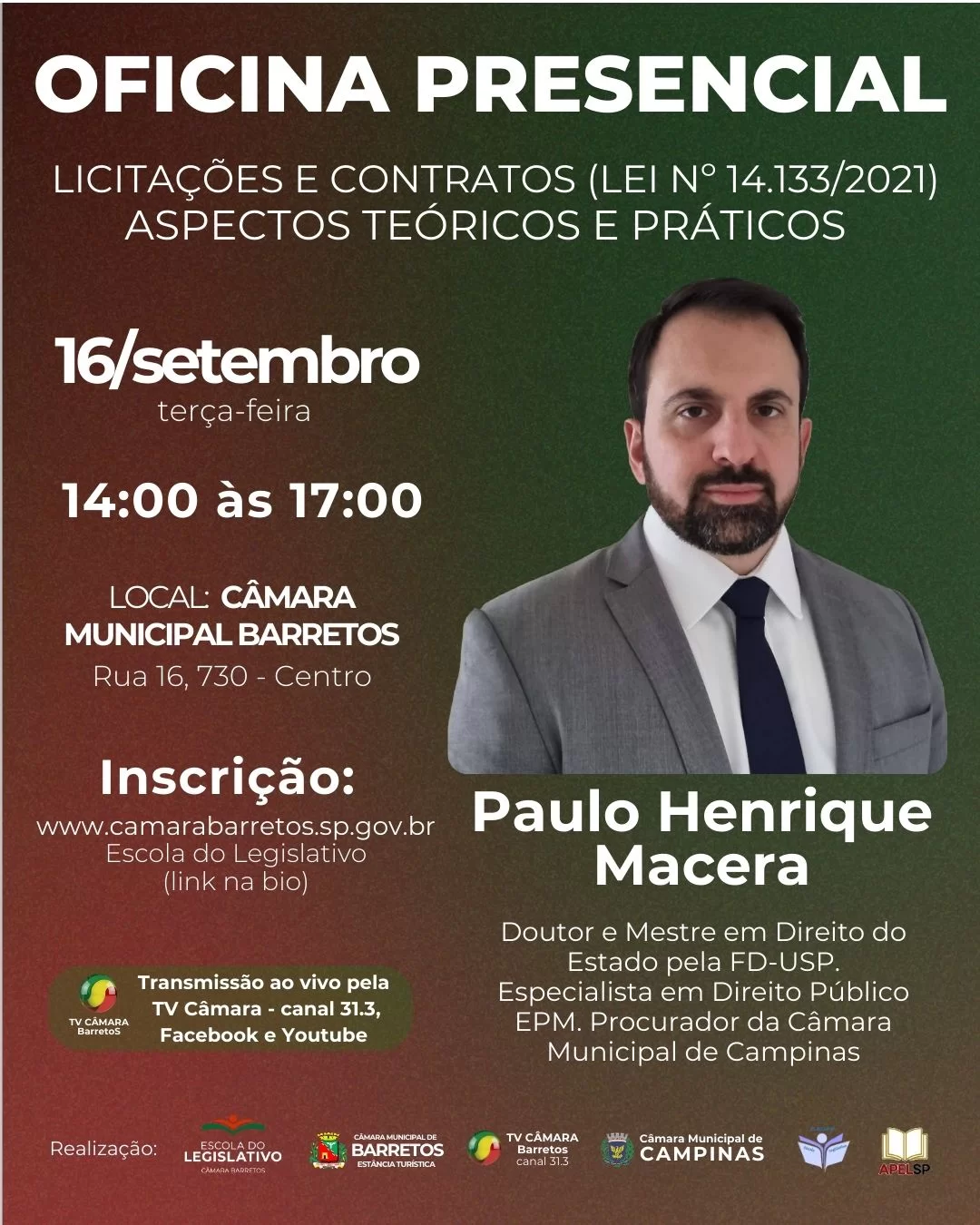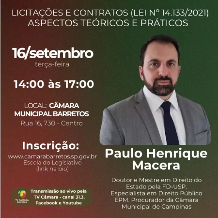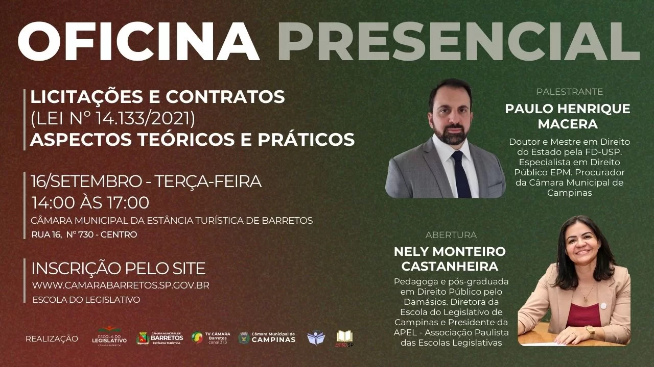 A Escola do Legislativo de Barretos, em parceria com a Câmara Municipal de Campinas e a APEL (Associação Paulista das Escolas do Legislativo), realiza no dia 16 de setembro (terça-feira), das 14h às 17h,no Plenário da Câmara (Rua 16, nº 730- Centro), oficina presencial sobre a Nova Lei de Licitações e Contratos (Lei 14.133/2021): aspectos teóricos e práticos.