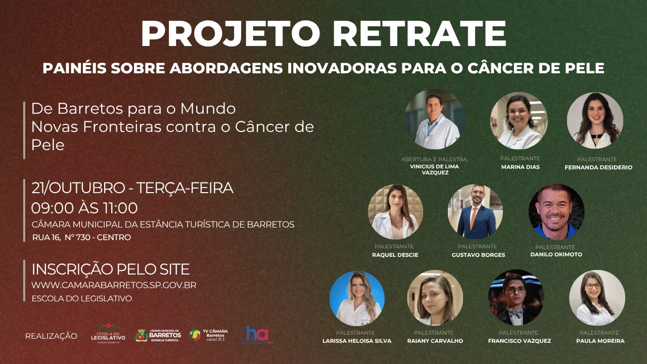 A Escola do Legislativo de Barretos, em parceria com o Hospital de Amor, apresentou na manhã do dia 21 de outubro (terça-feira), o PROJETO RETRATE, com o tema “De Barretos para o Mundo: Novas Fronteiras contra o Câncer de Pele”. O encontro reuniu profissionais da saúde e especialistas que atuam na prevenção e tratamento da doença.