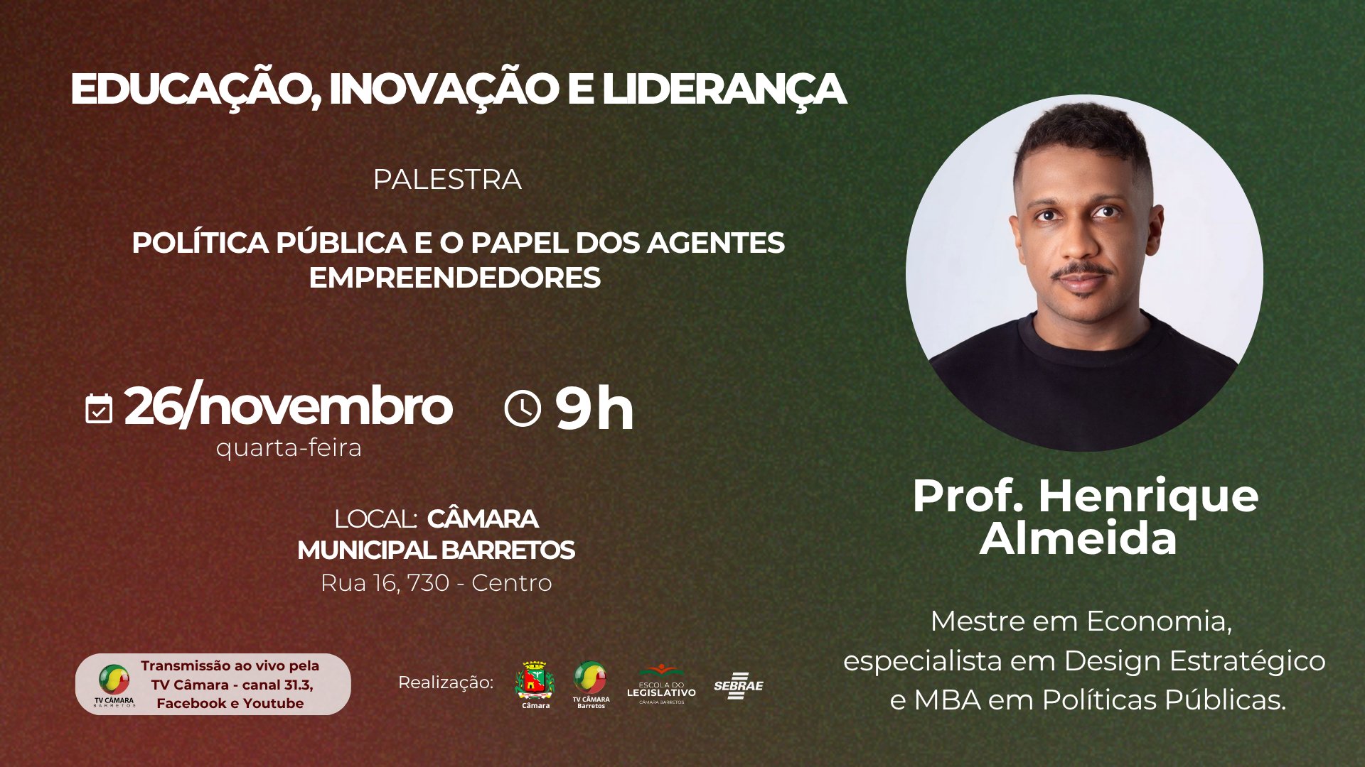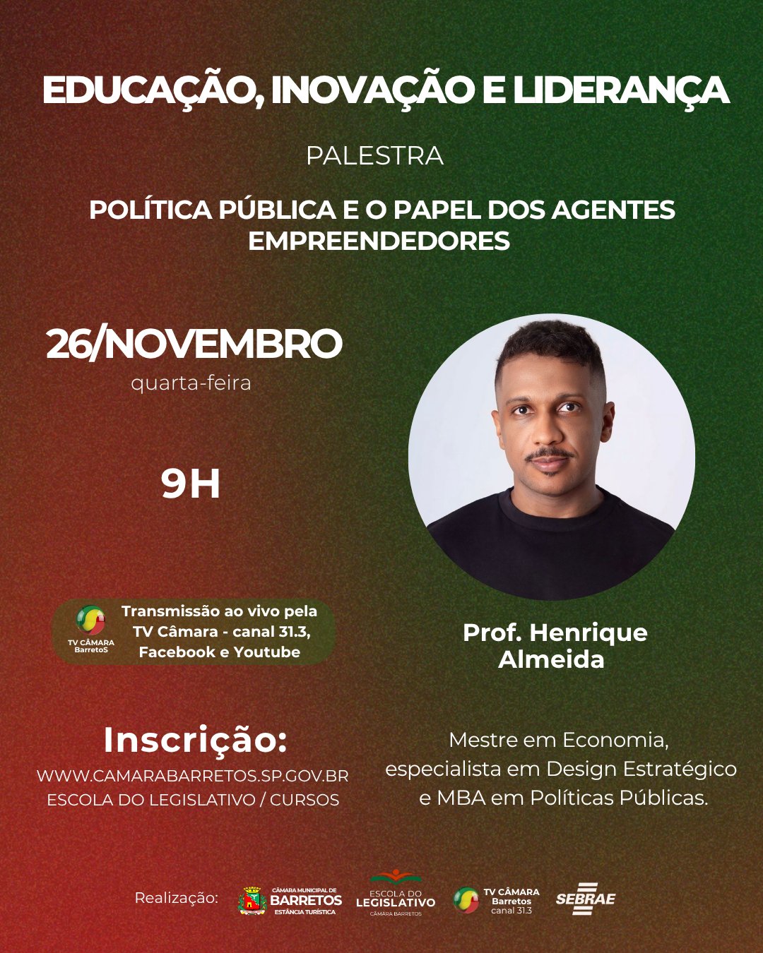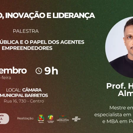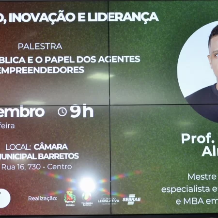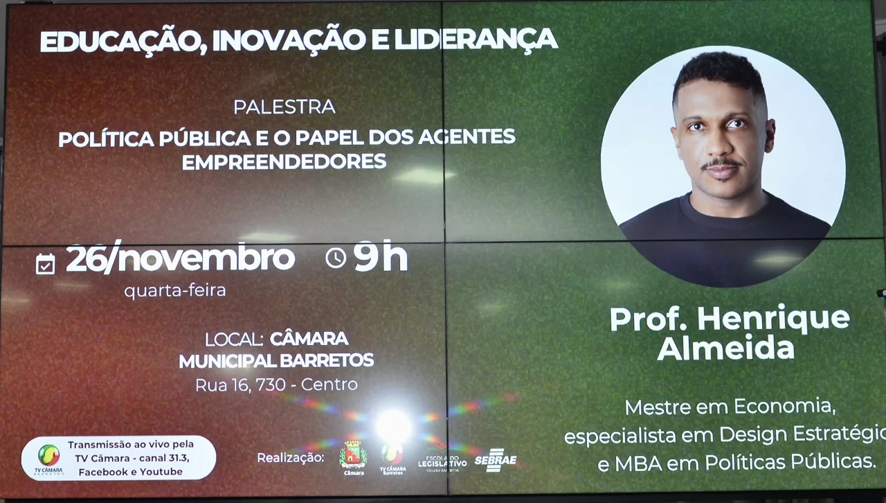 A Escola do Legislativo de Barretos realizou na manhã do dia 26 de novembro, palestra “Política Pública e o papel dos agentes empreendedores”, em parceria com o SEBRAE-SP e contou com a participação de Marco Vinholi, Diretor Técnico do Sebrae-SP e Henrique Almeida, professor da Faculdade Sebrae.
