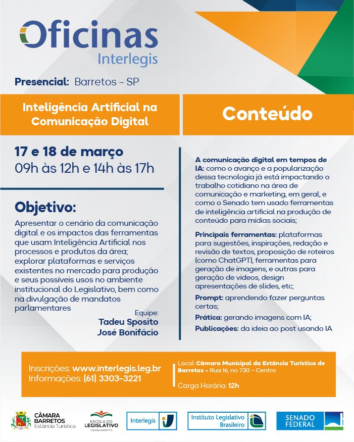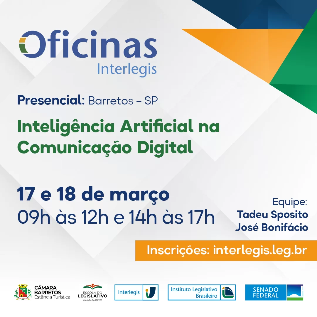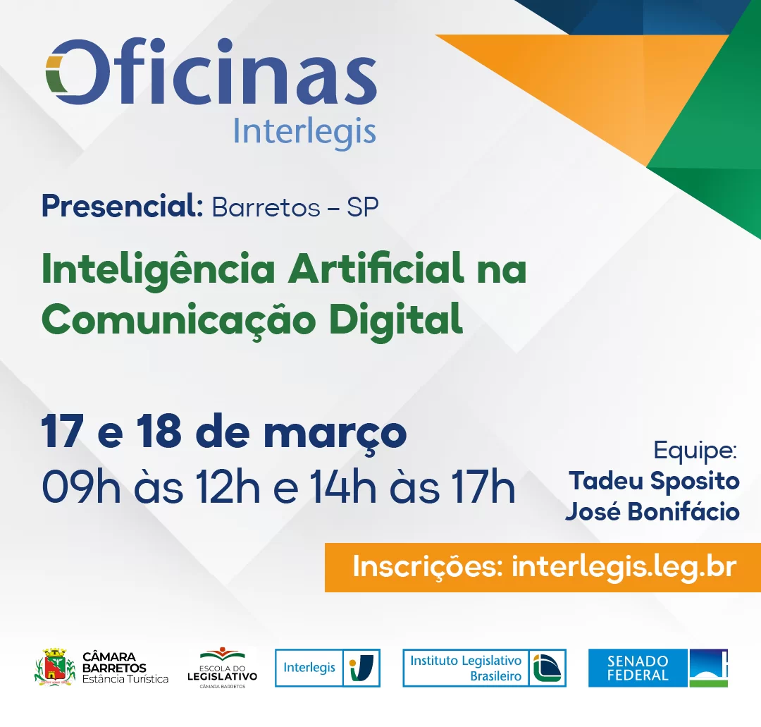 A Câmara Municipal da Estância Turística de Barretos, por meio da Escola do Legislativo, realizará nos dias 17 e 18 de março a oficina “Inteligência Artificial na Comunicação Digital”, iniciativa desenvolvida em parceria com o Senado Federal e o Interlegis, com foco na qualificação prática de servidores e equipes que atuam na comunicação institucional.