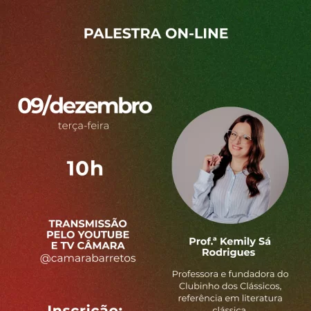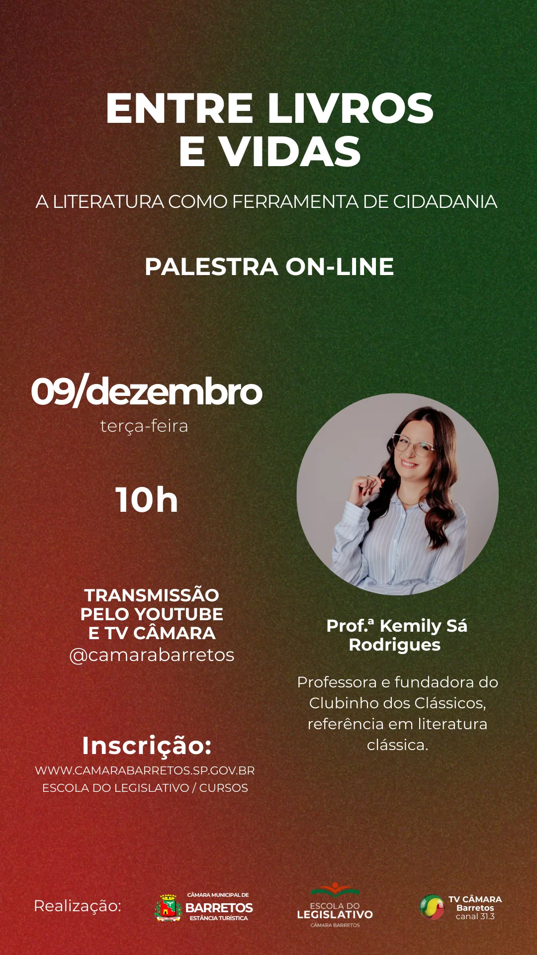 A Escola do Legislativo de Barretos realizará, na terça-feira, 09 de dezembro, às 10h, a palestra “Entre Livros e Vidas: A Literatura como Ferramenta de Cidadania”, ON LINE, com transmissão ao vivo pela TV Câmara (canal 31.3), YouTube e plataforma Zoom.