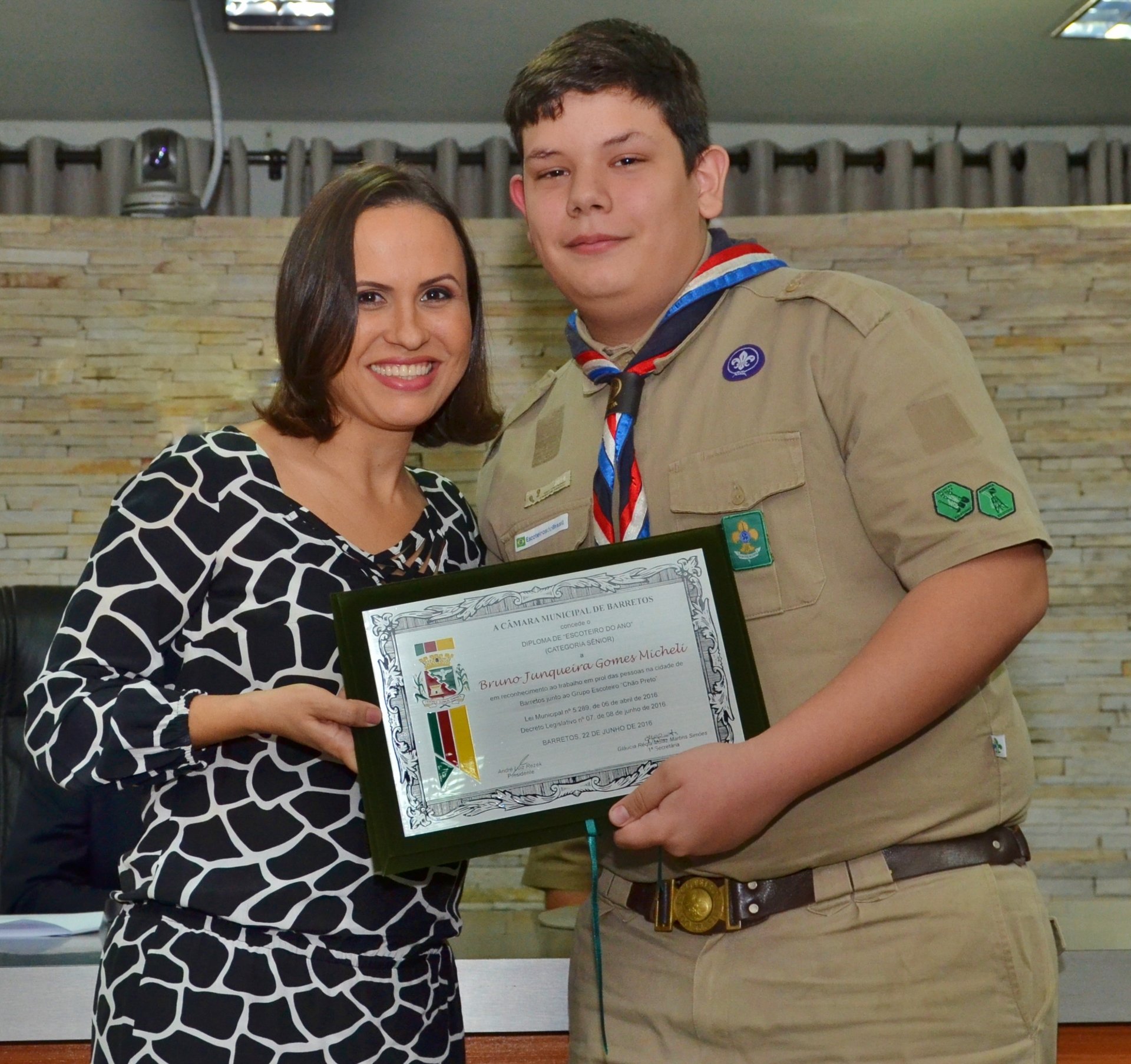 Na noite desta quarta, 22, a Câmara Municipal de Barretos realizou a entrega do Diploma de Escoteiro do ano aos jovens Byanca Miranda Batista Lopes, Fillipi Marques Souza e Bruno Junqueira Gomes Micheli.