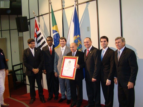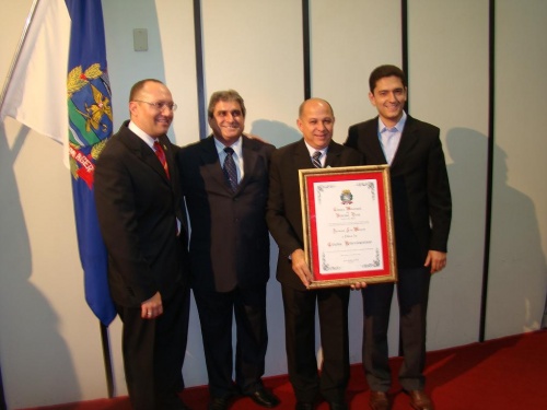 Os vereadores Luiz Umberto de Campos Sarti, “Kapetinha” e Leandro Anastácio prestigiaram a solenidade de entrega do Título de Cidadão Honorário de Ribeirão Preto, proposta pelo vereador Marcelo Palinkas, ao atual presidente do clube Os Independentes, Jerônimo Luiz Muzetti, que aconteceu noite de quinta-feira. A solenidade de entrega aconteceu na noite de quinta-feira, dia 22, no plenário da Câmara Municipal de Ribeirão Preto. A solenidade contou com a presença de uma comitiva de 50 pessoas, que acompanharam a sessão solene presidida pelo vereador Cícero Gomes da Silva, presidente da Câmara Municipal de Ribeirão Preto.