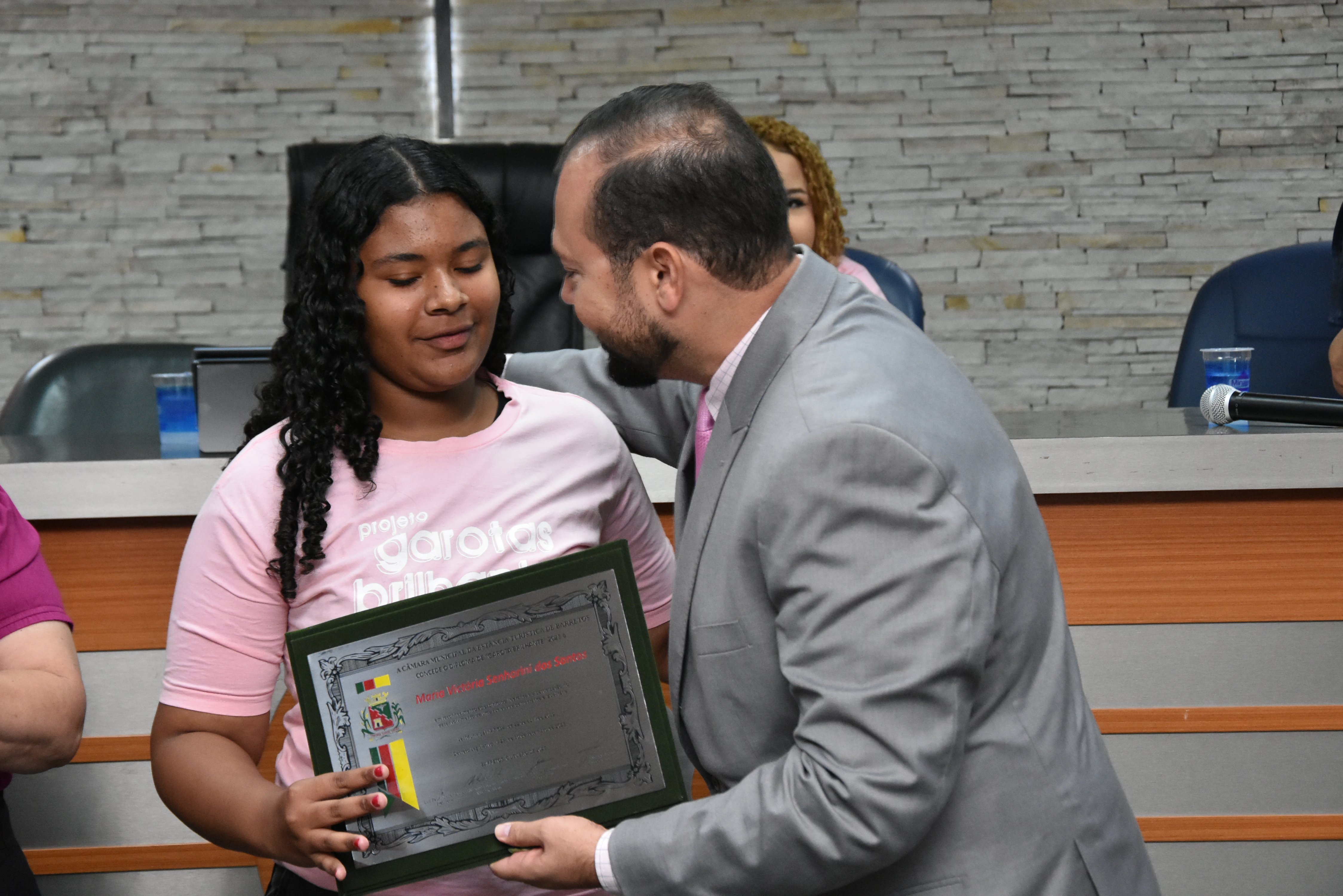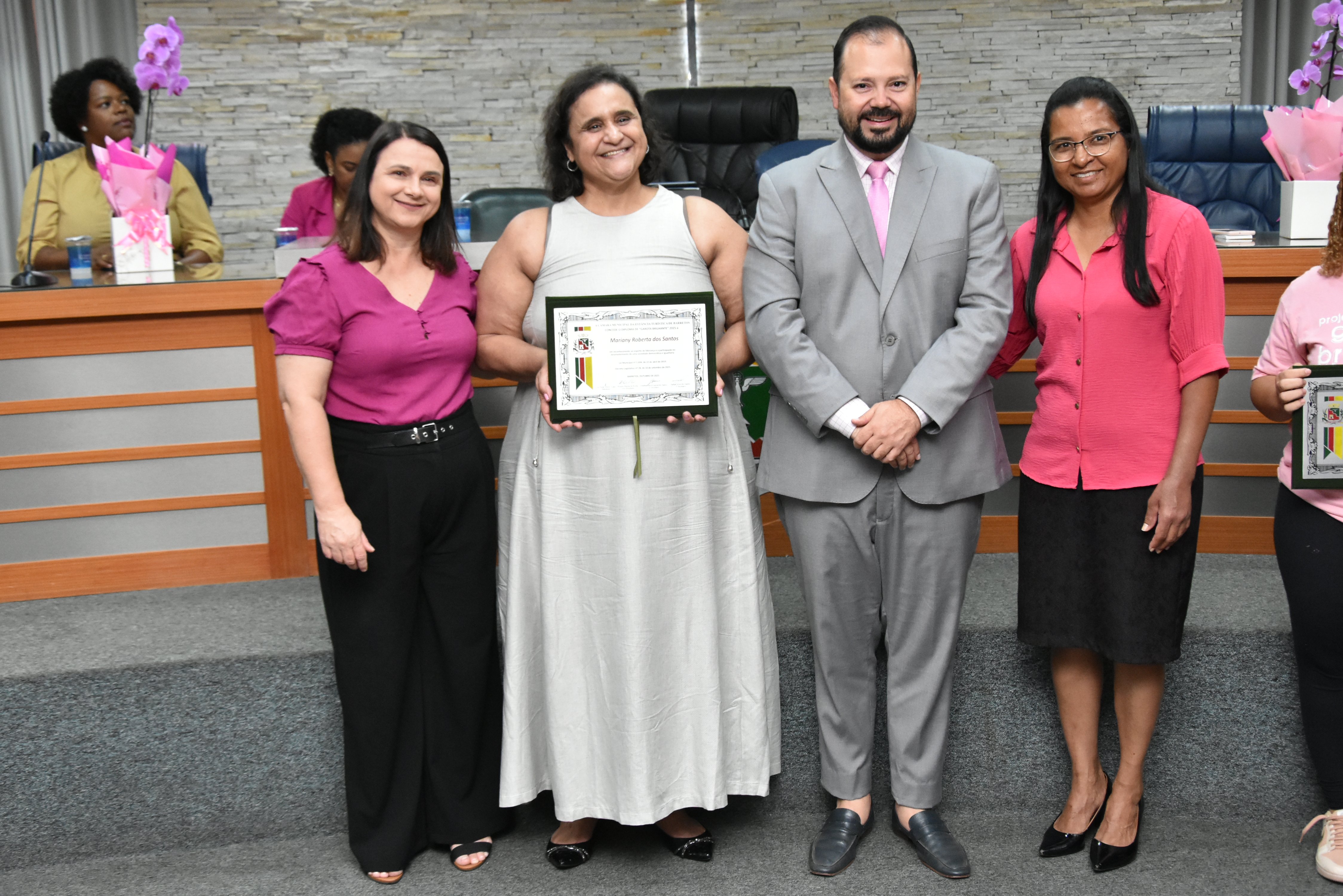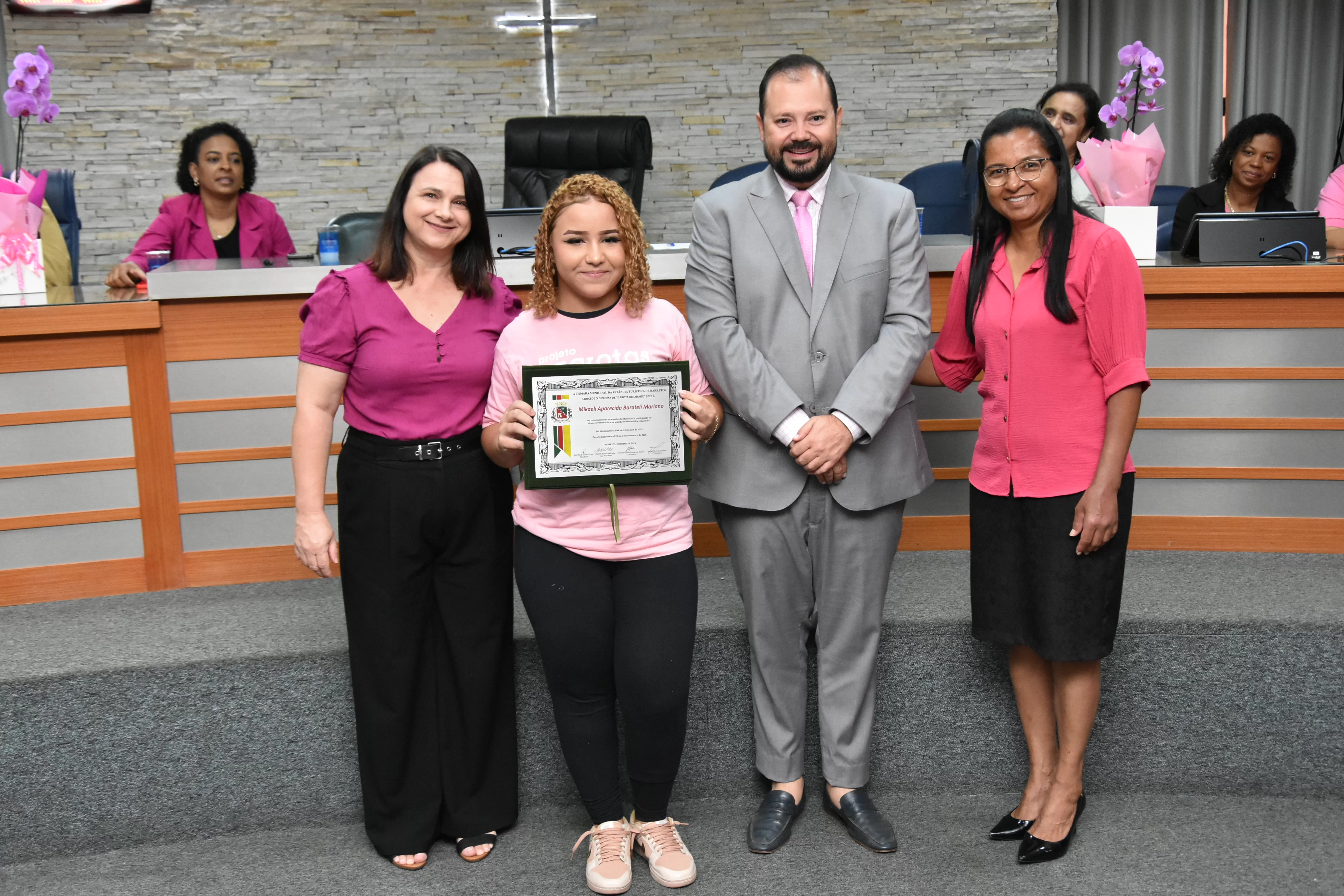 A solenidade foi conduzida pelo 2º Secretario da Câmara, Vereador Itamar Alves dos Santos (PSD) e contou ainda com presença do vereador Marcos Mariano (UNIÃO); da Coordenadora do CAAF -Centro Adventista de Apoio à Família de Barretos, Adriana Gonçalves Ferreira; da Assistente Social do Projeto Garotas Brilhantes, Pâmela Camargo; da Coordenadora Regional da ADRA - Agência Adventista de Desenvolvimento e Recursos Assistenciais, Estela Maris Miller Reis; da Diretora da Escola Estadual Mario Vieira Marcondes (local onde funciona o projeto Garotas Brilhantes); Marta Regina Rocha, Secretária Municipal de Assistência Social e Desenvolvimento Humano, Juliana Adão.