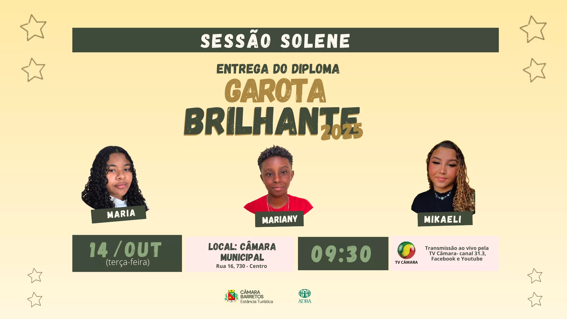 A Sessão Solene para a entrega dos Diplomas "Garota Brilhante" acontece em cumprimento à Lei Municipal nº 5.694/2019, da ex-vereadora Paula Lemos.