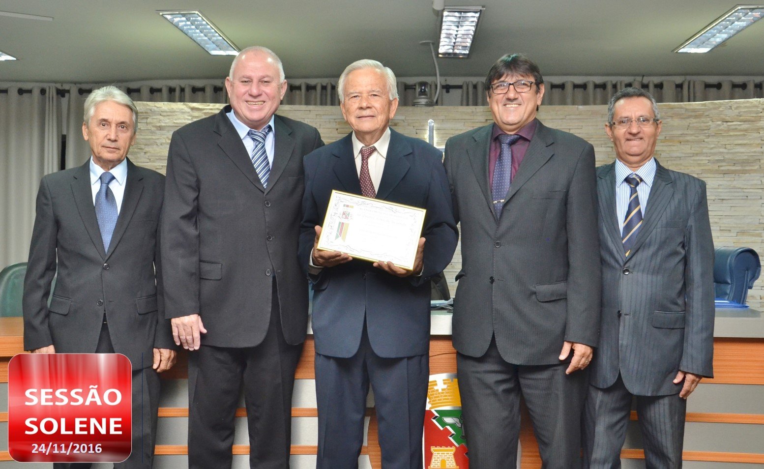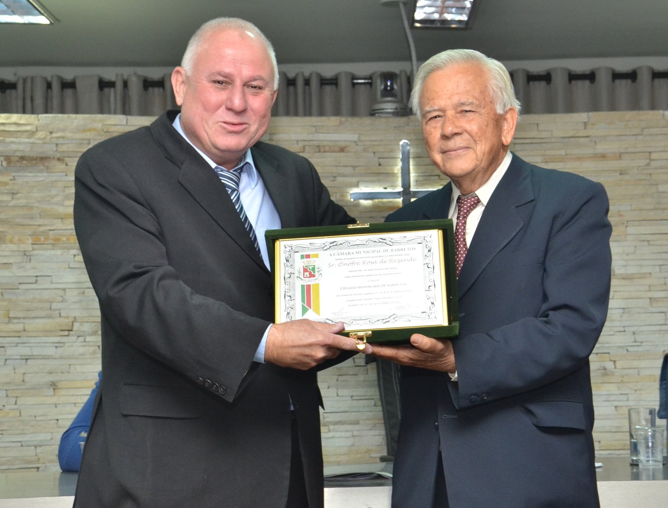 Nesta quinta, 24, a Câmara Municipal realizou a entrega do Título de Cidadão Honorário de Barretos ao Sr. Onofre Rosa de Rezende. A homenagem aconteceu durante Sessão Solene do Legislativo.