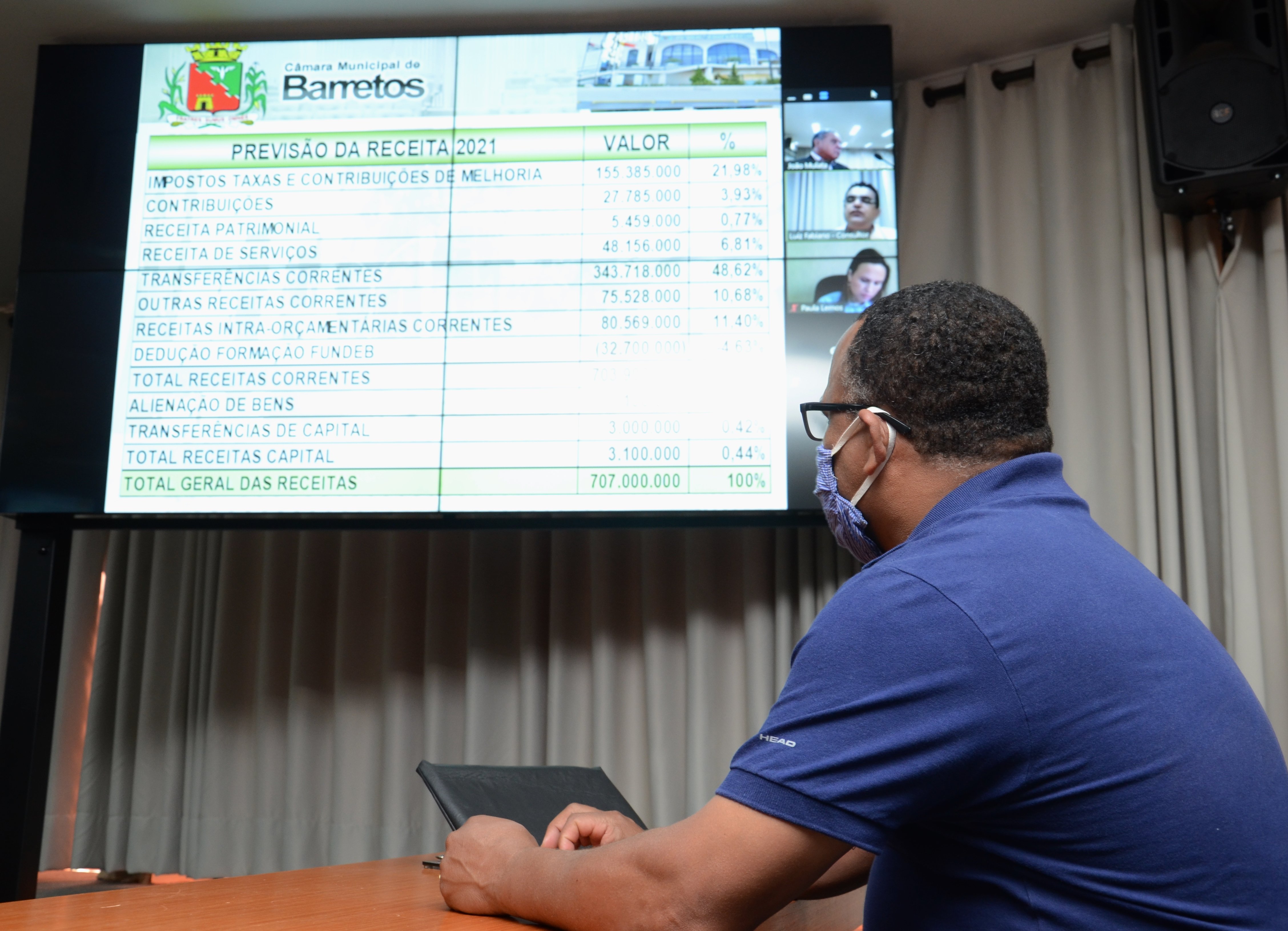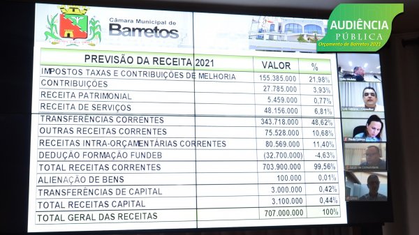 Na manhã desta sexta-feira, 16 de outubro, a Câmara Municipal realizou a Audiência Pública para apresentação e análise do Orçamento de Barretos para o ano de 2021. A previsão é de 707 milhões que serão utilizados na administração do Município. Os números estão detalhados no Projeto de Lei 134/2020, referente à Lei Orçamentária Anual - LOA, que estima a receita e fixa a despesa de Barretos para 2021.