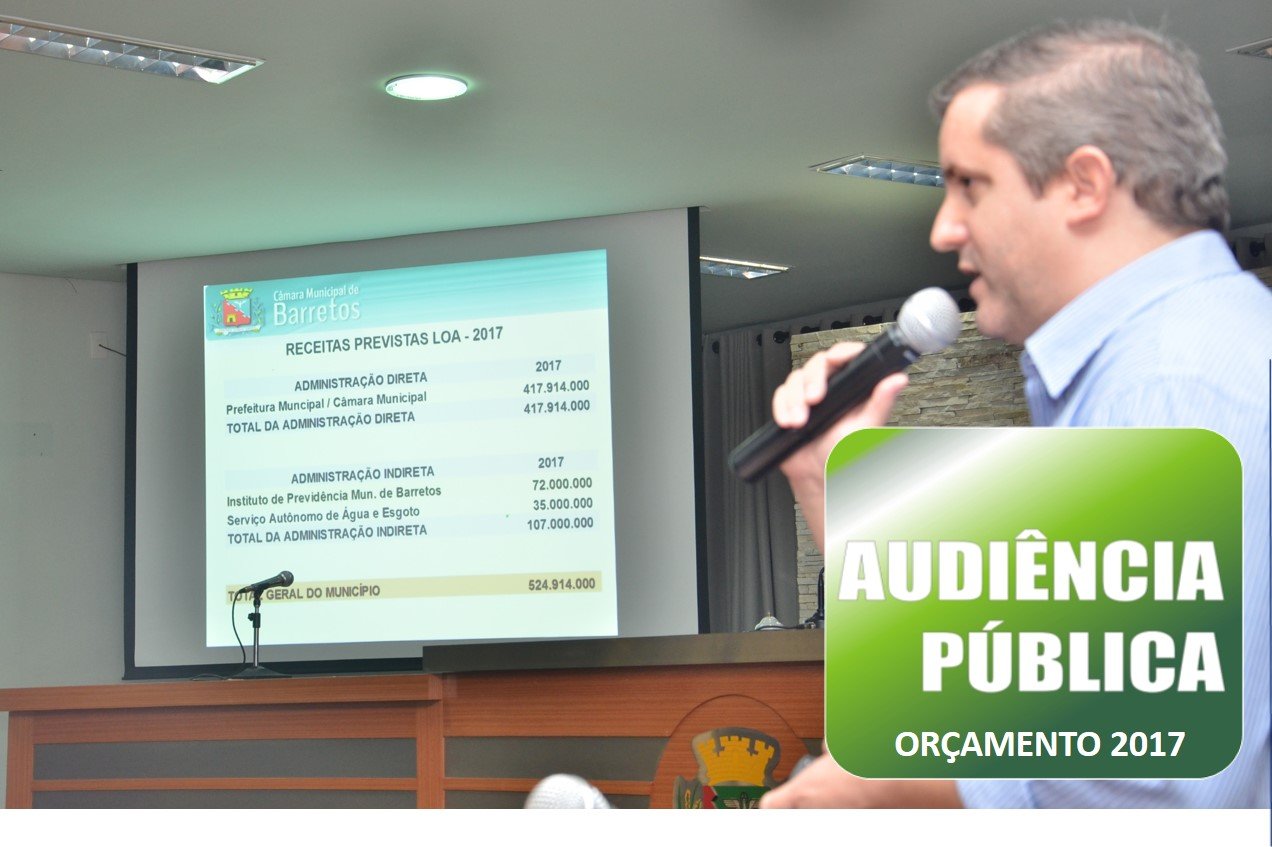 Aconteceu nesta quinta-feira, 13 de outubro, na Câmara Municipal, a Audiência Pública para demonstração do Orçamento de Barretos para o ano de 2017. Os detalhes apresentados estão detalhados em três projetos de autoria da Prefeitura de Barretos.