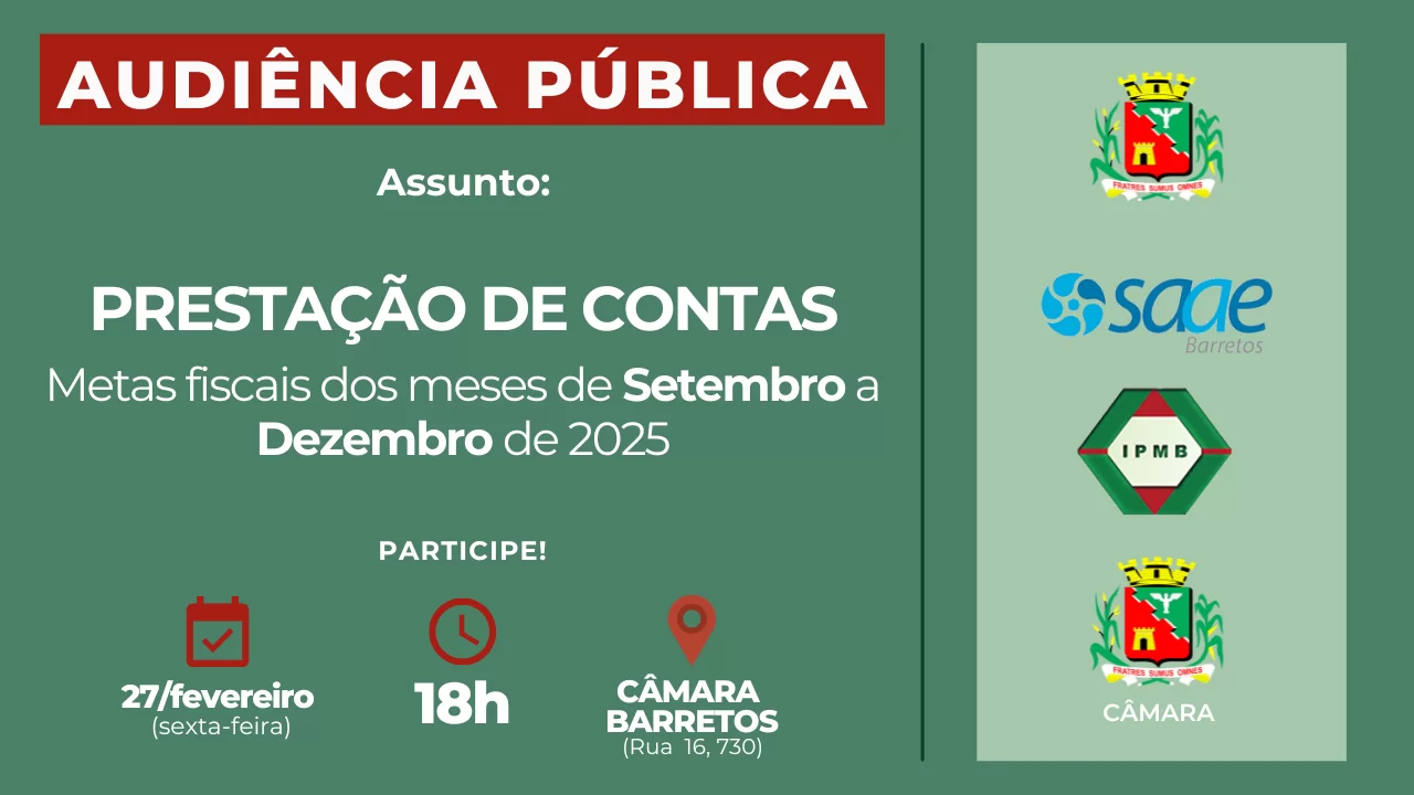 A Câmara realizará no próximo dia 27 de fevereiro (sexta-feira), às 18h, a Audiência Pública para demonstração e avaliação da situação financeira do Município da Estância Turística de Barretos nos meses de setembro a dezembro de 2025. Será a terceira "prestação de contas" da gestão do Prefeito Odair Silva.