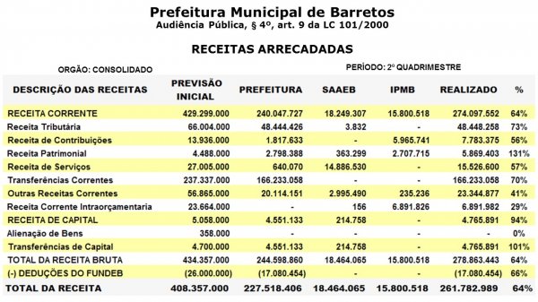 Durante a Audiência, que foi transmitida ao vivo pela TV Câmara Barretos – canal digital 64.1 – e pelo site do Legislativo, o consultor Gaspar da Costa e o contador Milton Ferreira Filho apresentaram dados indicando que o Município de Barretos já arrecadou, até o mês de agosto de 2015, R$ 261.782,98 (duzentos e sessenta e um milhões, setecentos e oitenta e dois mil reais e noventa e oito centavos). Veja o quadro abaixo.
