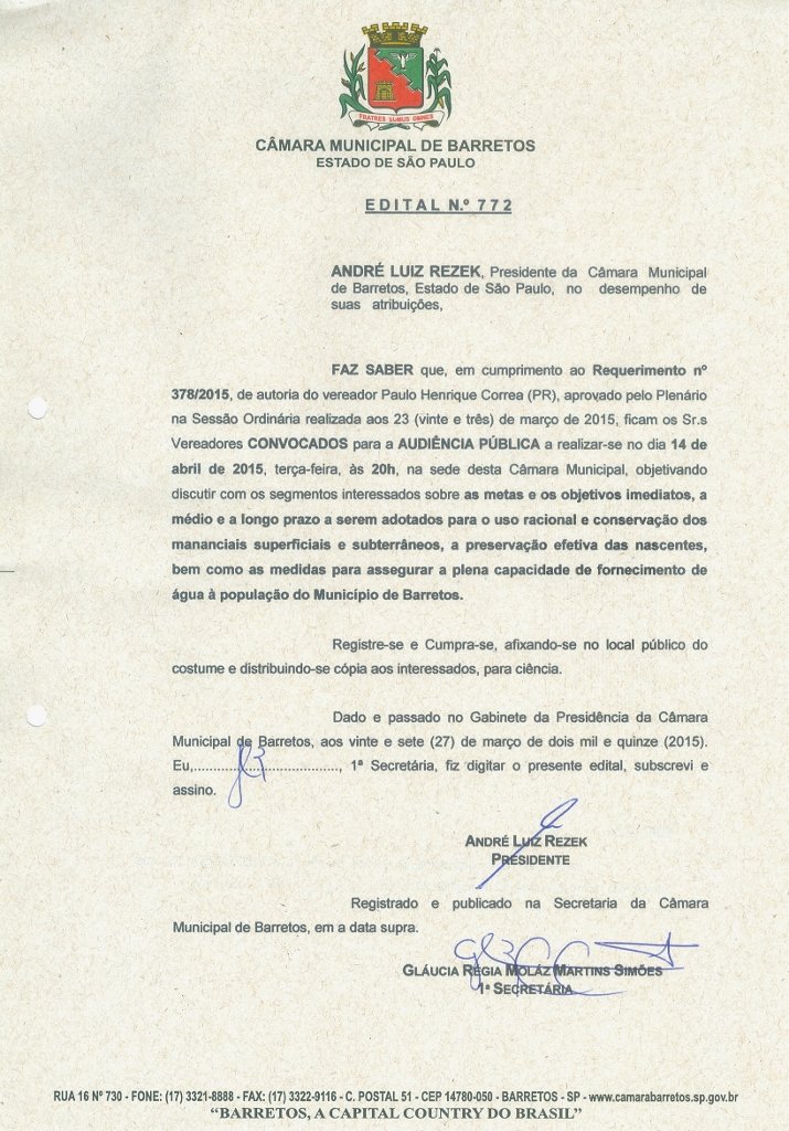 A audiência é resultado de pedido do Vereador Paulo Henrique Correa (PR), feito por meio do Requerimento nº 0378/2015. No documento, o vereador destaca os fatos que aconteceram em Barretos devido à chamada "crise hídrica", a falta de chuvas que provocou problemas nos reservatórios de água da cidade.