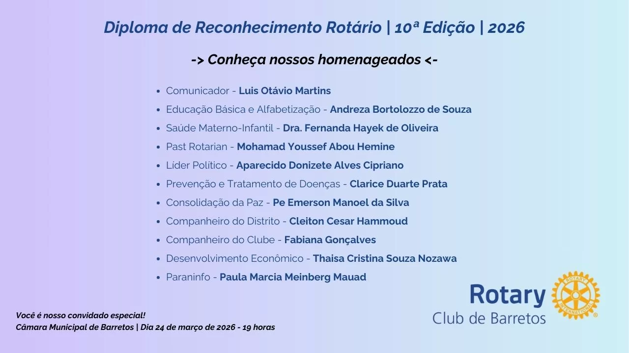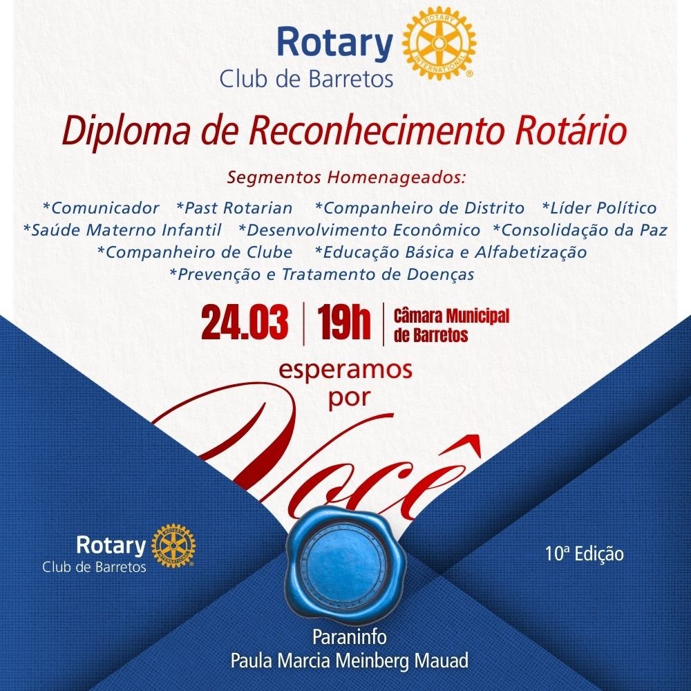 Durante a solenidade, o Rotary Club de Barretos, atualmente presidido por Rose Fontes Dalkirane, fará a entrega do Diploma Reconhecimento Rotário 10ª Edição, a personalidades de 11(onze) segmentos: Saúde Materno Infantil, Companheiro do Distrito, Past Rotarian , Líder político, Desenvolvimento Econômico, Educação Básica e Alfabetização, Consolidação da Paz, Companheiro do Clube, Comunicador, Prevenção e tratamento de doenças, além do Paraninfo.