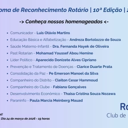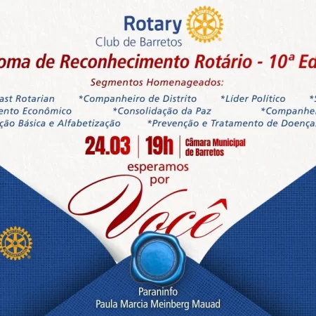 Rotary Club de Barretos fará a entrega do Diploma de Reconhecimento Rotário 10ª Edição a personalidades de segmentos da comunidade