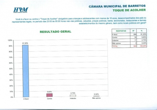 Os pesquisadores fizeram várias perguntas, entre elas, “Você é a favor ou contra o “Toque de Acolher” obrigatório para crianças e adolescentes com menos de 16 anos, desacompanhados dos pais ou representantes legais, no período das 23h às 05horas, nas vias públicas, calçadas, praças públicas, bares, lanchonetes, restaurantes e demais estabelecimentos do mesmo gênero, bem como locais públicos em geral? Para esta pergunta, o resultado apresentado foi o seguinte: a favor – 568 pessoas – 91,32%; contra 35 entrevistados – 5,63%; indecisos 17 – 2,73% e não opinaram 2 – 0, 32%.