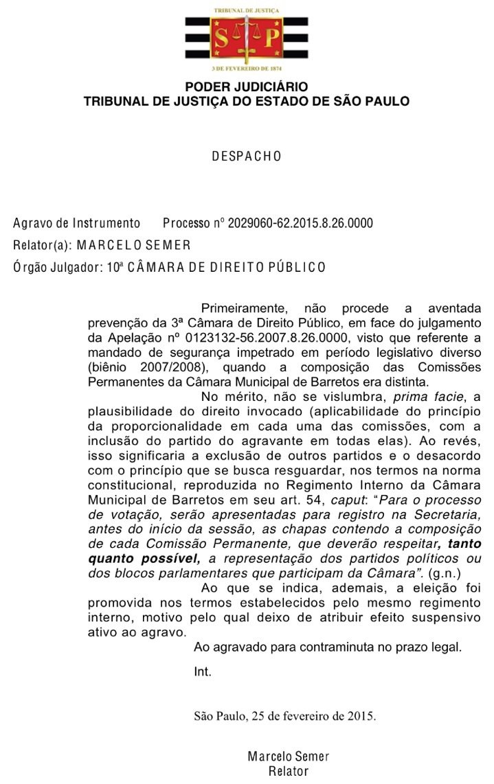Em decisão divulgada nesta quarta-feira, 25, o Desembargador Marcelo Semer, da 10ª Câmara de Direito Público do Tribunal de Justiça do Estado de São Paulo, negou liminarmente ao Vereador Videlson Paixão Leite Júnior “Juninho Leite” (PTB) o pedido para que fosse realizada nova votação para formação das Comissões Permanentes da Câmara Municipal. Desta forma, fica mantida a decisão do Juiz da Primeira Vara Cível de Barretos, Dr. Cláudio Barbaro Vita.