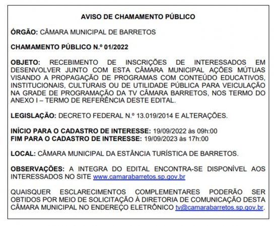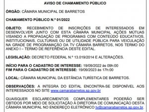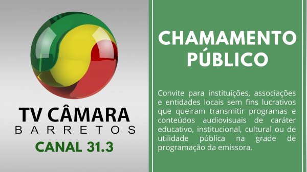 A TV Câmara Barretos - em sinal aberto no canal 31.3 - publicou nesta terça-feira (16 de agosto) o Chamamento Público para convidar instituições sem fins lucrativos do Município interessadas em veicular programas e conteúdos audiovisuais na grade de programação da emissora.