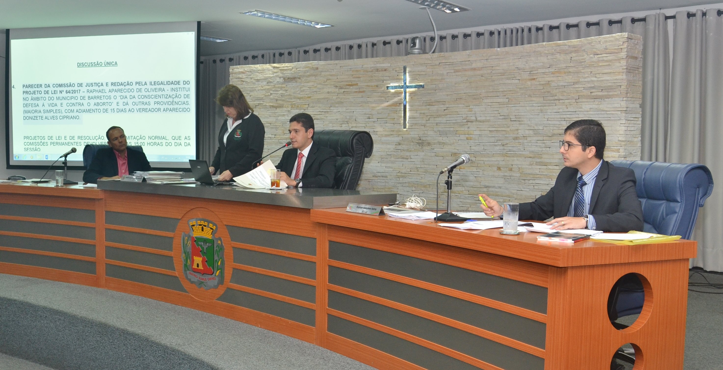 PARECER DA COMISSÃO DE JUSTIÇA E REDAÇÃO PELA ILEGALIDADE DO PROJETO DE LEI Nº 64/2017 – de autoria do Vereador RAPHAEL APARECIDO DE OLIVEIRA - INSTITUI NO ÂMBITO DO MUNICIPIO DE BARRETOS O “DIA DA CONSCIENTIZAÇÃO DE DEFESA À VIDA E CONTRA O ABORTO” E DÁ OUTRAS PROVIDÊNCIAS. COM ADIAMENTO DE 15 DIAS AO VEREADOR APARECIDO DONIZETE ALVES CIPRIANO.