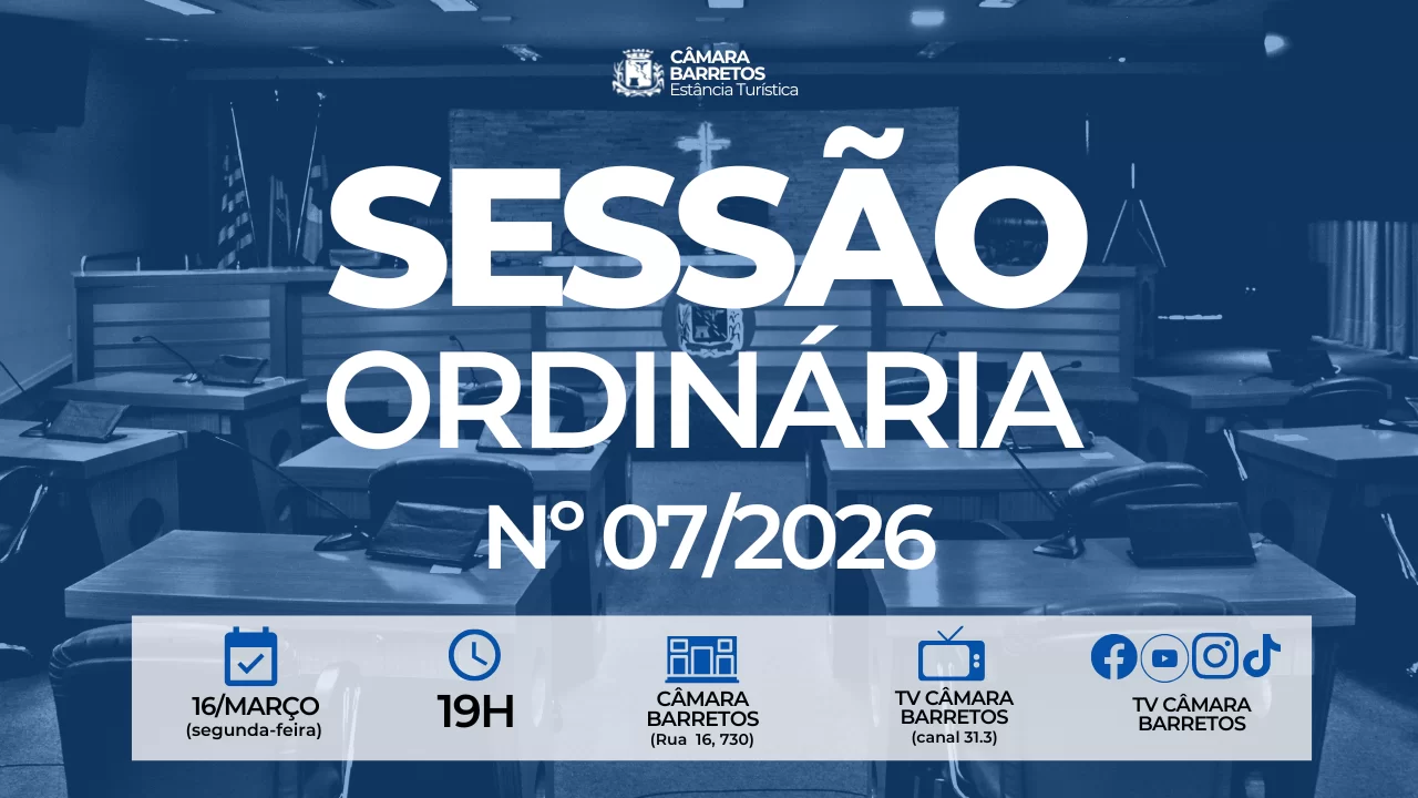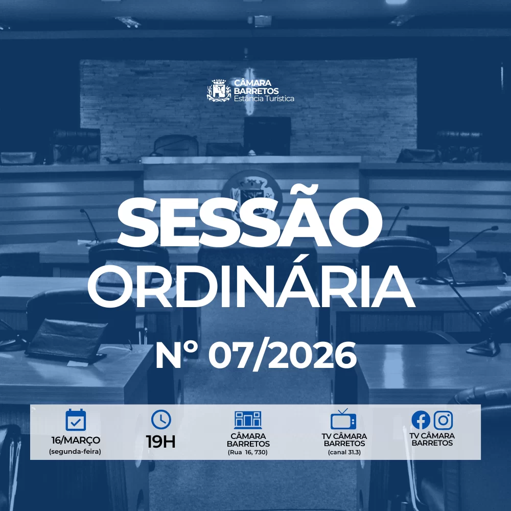 A Câmara de Barretos realiza na segunda-feira (16/março), às 19h, a 7ª Sessão Ordinária de 2026. Ao todo serão discutidas e votadas 14 matérias: 8 Projetos de Lei, 3 Projetos de Decreto Legislativo, 1 Projeto de Lei Complementar e 2 Pareceres de Inconstitucionalidade.