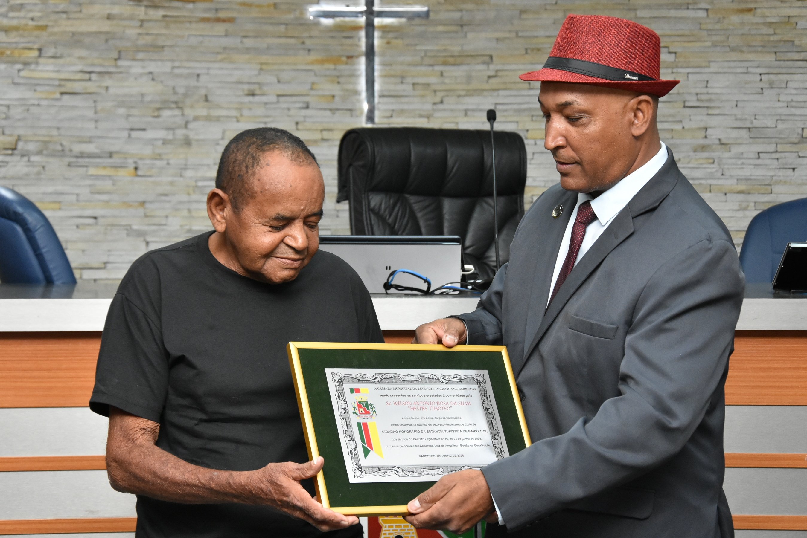 A Câmara Municipal de Barretos realizou no dia 1º de outubro (quarta-feira), às 19h, Sessão Solene para entrega do Título de Cidadão Honorário da Estância Turística de Barretos ao Sr. Wilson Antonio Rosa da Silva, conhecido como “Mestre Timóteo”.